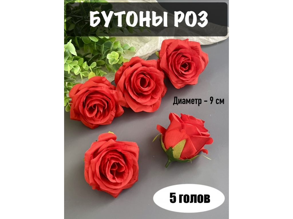 Головы бутоны роз, d-9 см, красный, 5 шт
