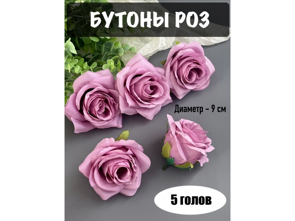 Головы бутоны роз, d-9 см, сиреневый, 5 шт