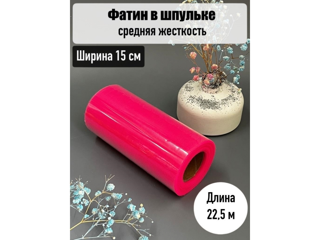 Фатин - это очень легкая сетчатая ткань средней жесткости, еще ее по другому называют вуаль, выполненная из полиэстерной нити. Фатин является однородным материалом без каких-либо шершавых участков. Он достаточно широко используется для создания праздничных нарядов, вечерних и свадебных платьев, юбочек туту, а также предметов тканого (банты, шлейки, ленты, цветы). Широкое применение фатин нашел в декорировании праздничных зон. Также его используют при создании топиариев, помпонов и гирлянд. Цвет в реальности может отличаться от фото из-за разной настройки цвета/контрастности мониторов.