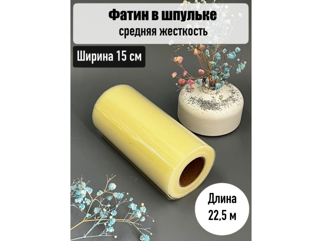 Фатин - это очень легкая сетчатая ткань средней жесткости, еще ее по другому называют вуаль, выполненная из полиэстерной нити. Фатин является однородным материалом без каких-либо шершавых участков. Он достаточно широко используется для создания праздничных нарядов, вечерних и свадебных платьев, юбочек туту, а также предметов тканого (банты, шлейки, ленты, цветы). Широкое применение фатин нашел в декорировании праздничных зон. Также его используют при создании топиариев, помпонов и гирлянд. Цвет в реальности может отличаться от фото из-за разной настройки цвета/контрастности мониторов.