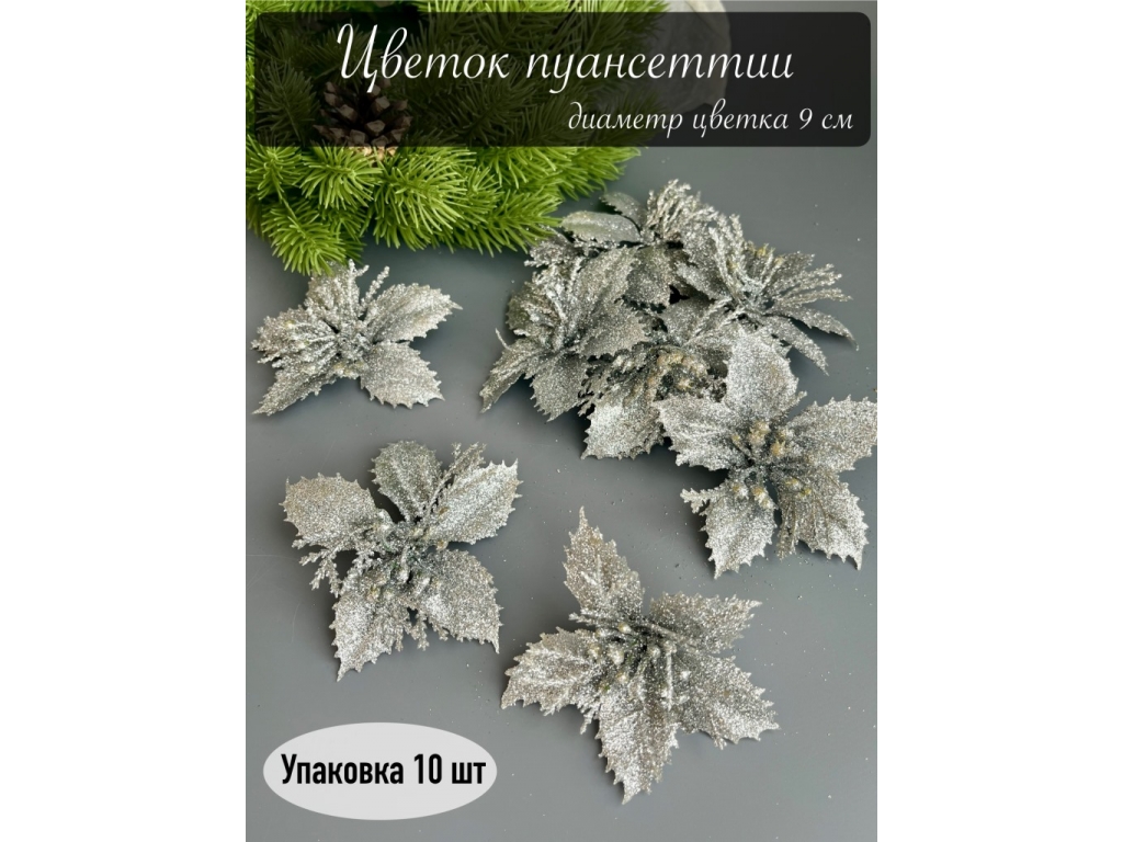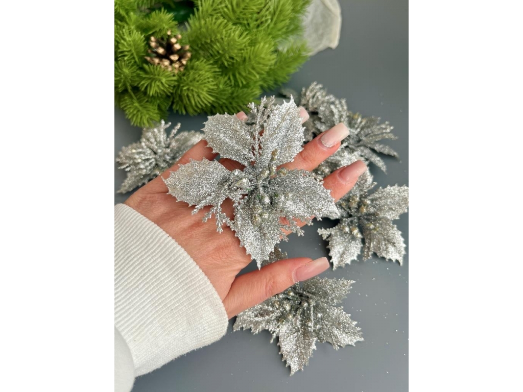 Голова пуансеттии мерцающая для ветки, венка (серебряный), 9 см, 10 шт